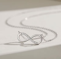 „Eternal Grace“ je jemný a nadčasový náhrdelník s klasikým symbolem nekonečna, jehož jedna polovina je osázena drobnými čirými zirkony pro decentní třpyt. Vyroben z kvalitního 925 sterling stříbra, délka 40 + 5 cm ho činí univerzálním doplňkem, který krásně vypadá samostatně i ve vrstvení. Lehký (≈1,90 g) a pohodlný — ideální jako symbol trvalého pouta nebo elegantní každodenní šperk. Dodáváno v dárkovém balení.
