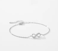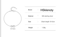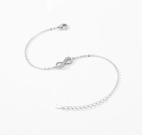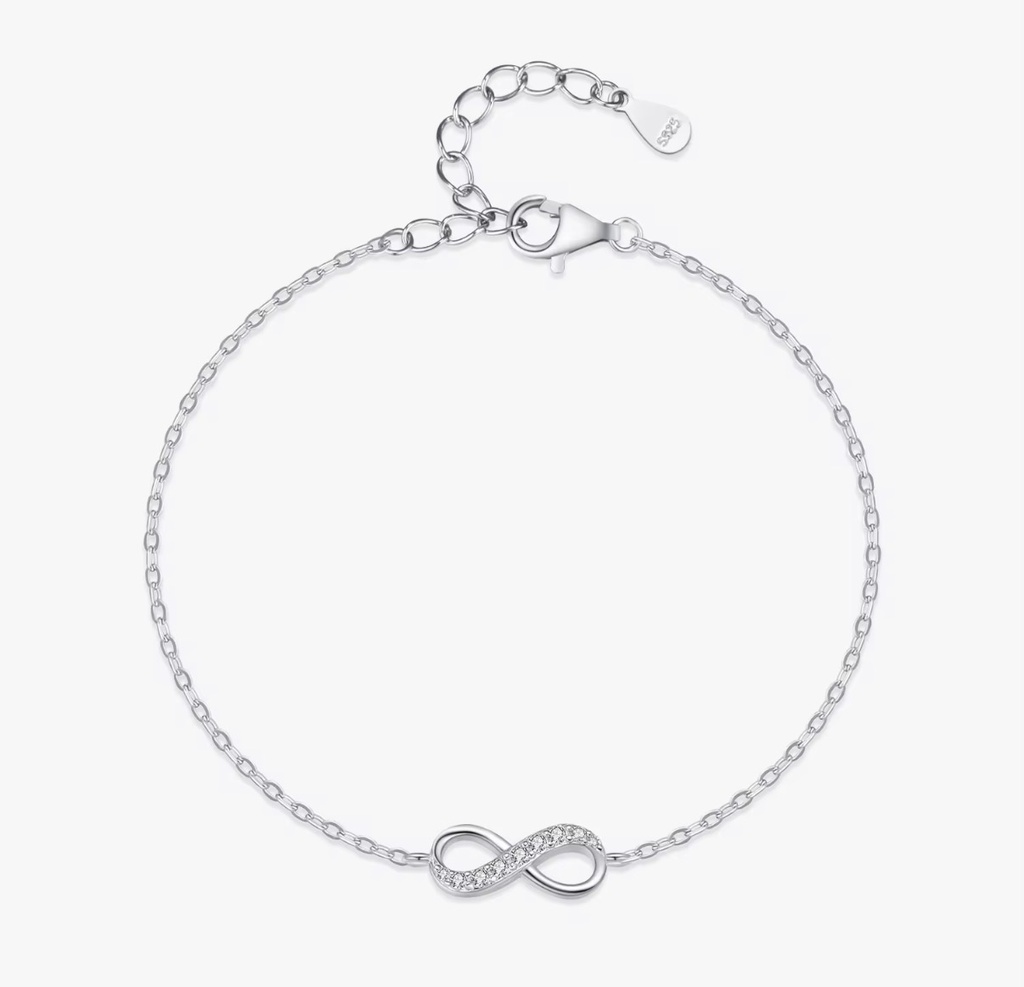 Jemný 925 sterling stříbrný náramek s malým symbolem nekonečna zdobeným pavé zirkony; délka 15 + 3 cm, váha ≈ 1,28 g. Detailní informace