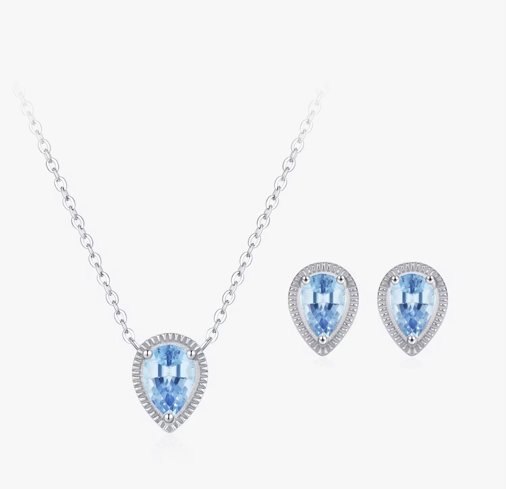 Něžná sada s kapkovým přívěskem a odpovídajícími peckami osazenými světle modrými zirkony — jemný, chladivý lesk pro každodenní i slavnostní nošení. Detailní informace
