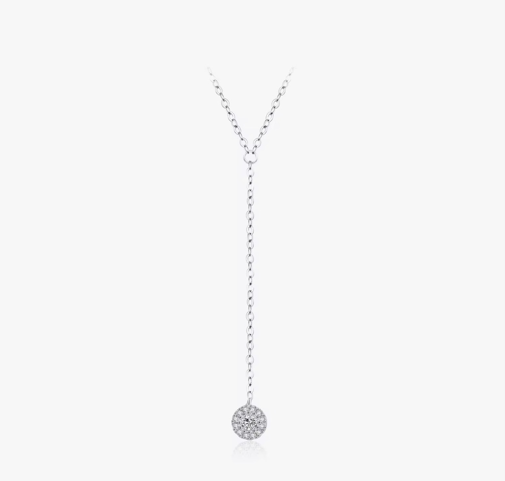 Jemný lariatový náhrdelník z 925 sterling stříbra s kulatým pavé zirkonovým přívěskem (Ø ≈ 6,3 mm) — elegantní prodloužení pro sofistikovaný dekolt. Detailní informace